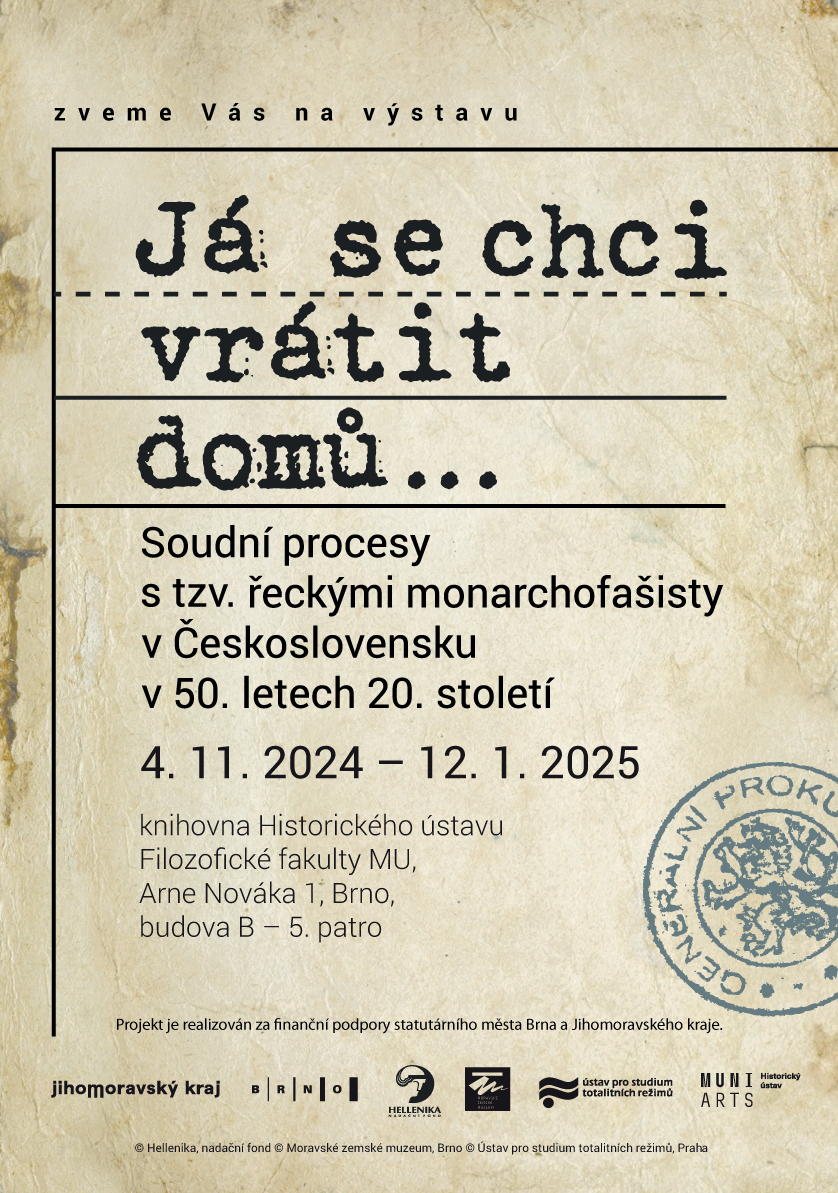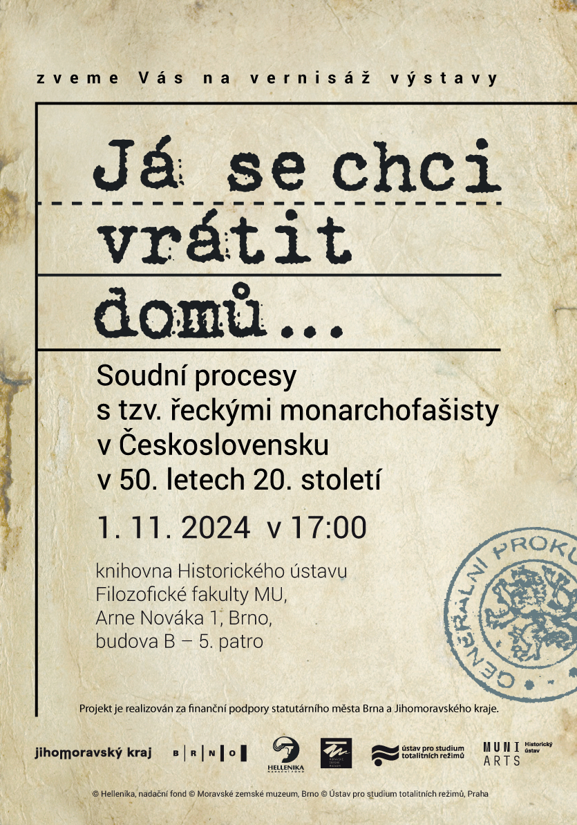 Migračním vlnám řeckých uprchlíků v roce 1948 byla věnována velká pozornost z hlediska výzkumného (rozhovory s přímými účastníky) i vědeckého (průběžné odborné i popularizační výstupy v podobě publikací, výstav, dokumentů). O následujících migračních vlnách dospělých Řeků a osudu jejich účastníků jsou dostupné informace méně početné a ucelené. Součástí příchozích dospělých Řeků na naše území byla také skupina zajatců tzv. demokratické armády, později nazývaných monarchofašisté. Byli pod trvalým dohledem státních orgánů, aby se v roce 1953 část z nich stala obětí soudních procesů vykonstruovaných tehdejším komunistickým režimem. Mnozí z této skupiny byli odsouzení a uvězněni, v následujícím roce pak vyhoštěni zpět do Řecka. Výstava reflektuje událost neznámou jak v české společnosti, tak v prostředí řecké národnostní menšiny v ČR. Prostřednictvím výstavy na roll-up panelech budou představeni obyčejní lidé, do jejichž života zasáhla zcela osudově válka, politika a také skutečnost, že se vyskytovali v nepravou dobu na nepravém místě. K prezentaci budou využity především archivní prameny, na jejichž zpracování se budou podílet především historikové (Ústav pro studium totalitních režimů, Historický ústav Filozofické fakulty Masarykovy univerzity) a etnologové (Etnografický ústav Moravského zemského muzea). Hlavním organizátorem výstavy je brněnský nadační fond Hellenika.
