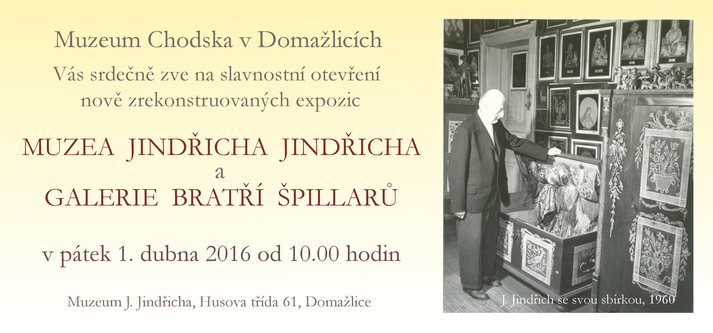 Muzeum Chodska v Domažlicích zve 1. dubna 2016 na slavnostní otevření nově zrekonstruovaných expozic Muzea Jindřicha Jindřicha a Galerie bratří Špillarů.