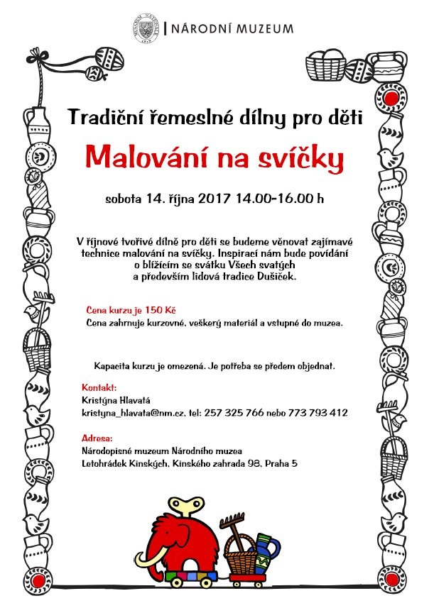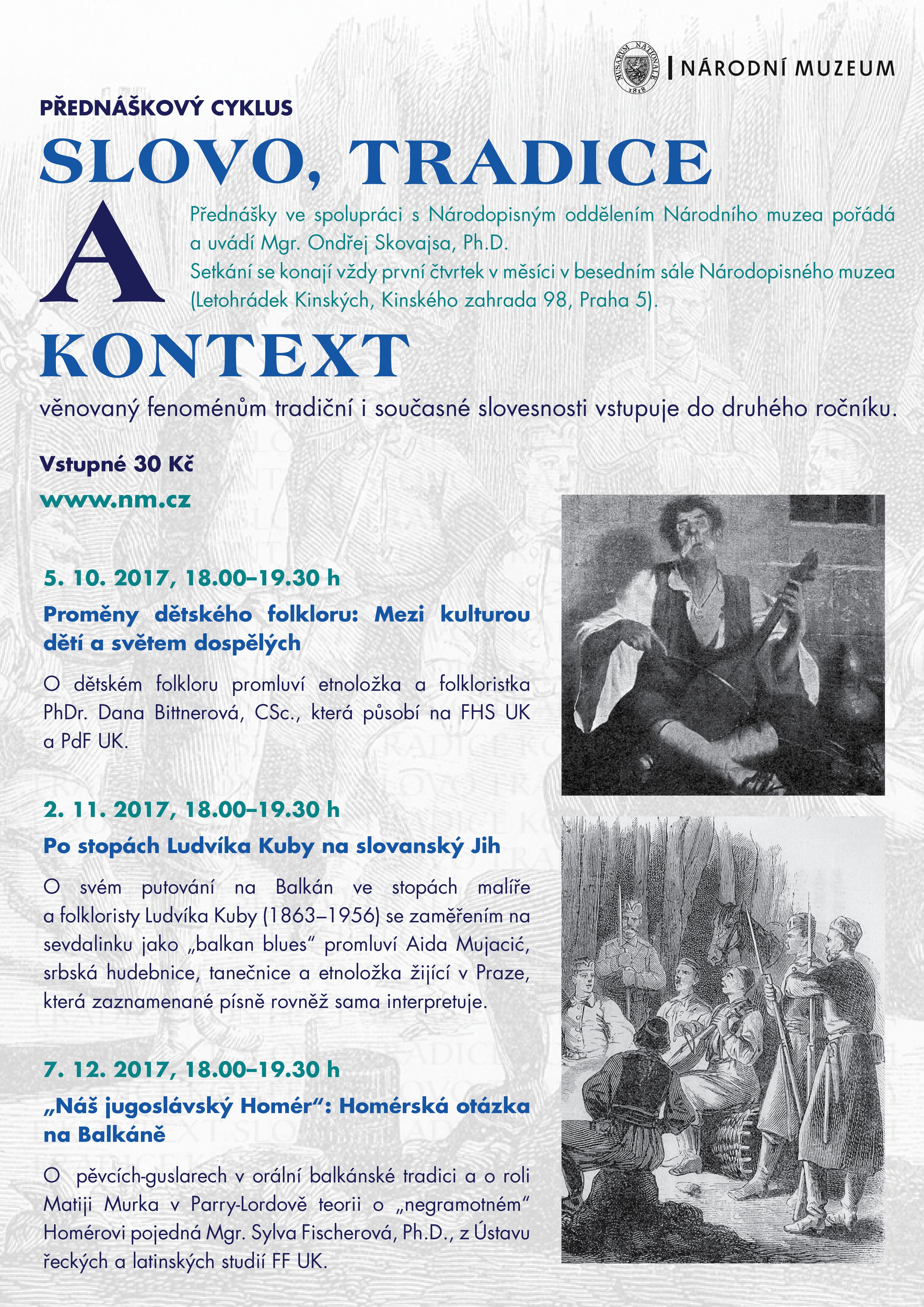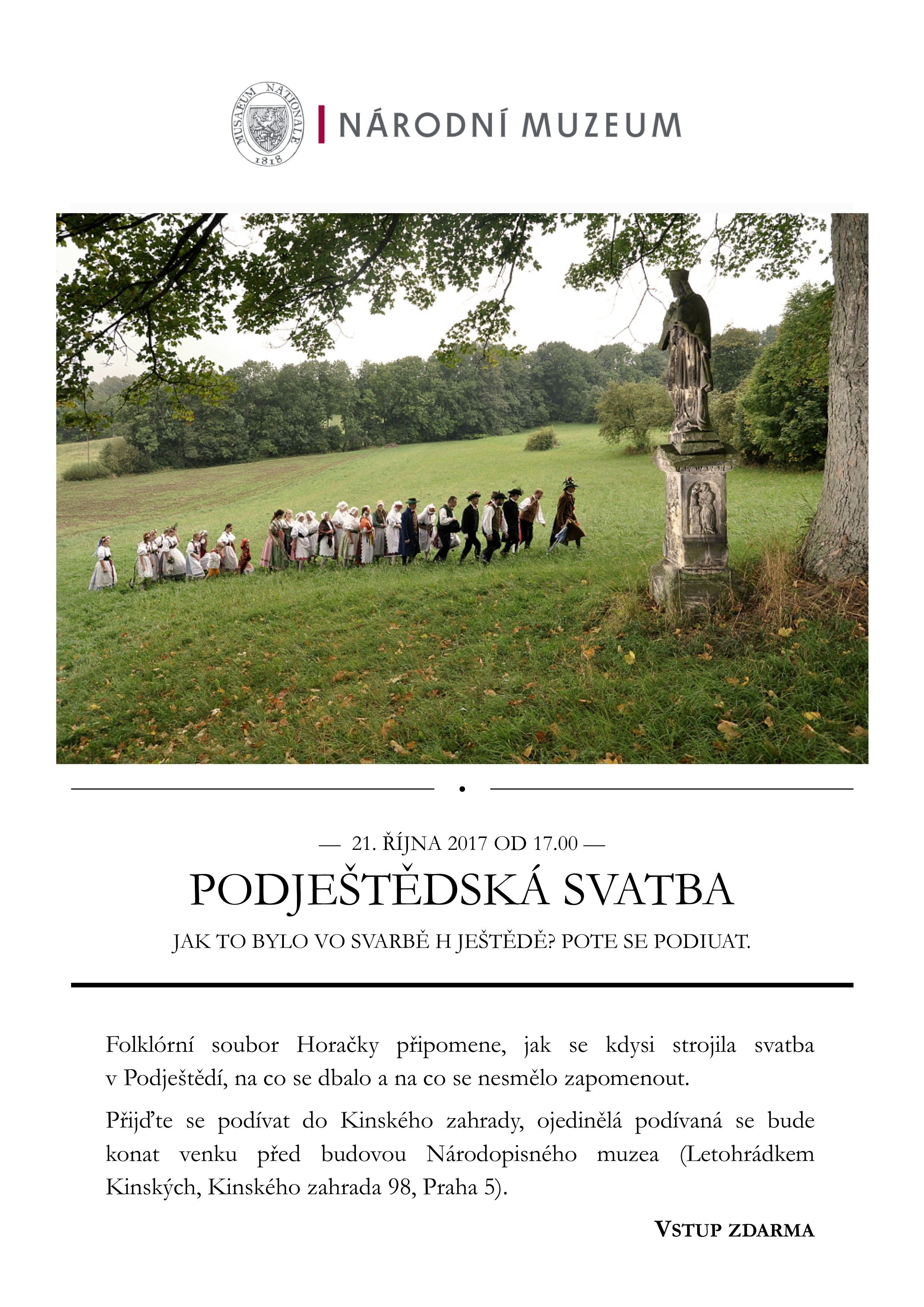 Národopisné muzeum Národního muzea v Praze připravilo na říjen několik akcí. Začíná se 1. října výstavou Selské brány na Boleslavsku. V přednáškovém cyklu Slovo tradice a kontext vystoupí 5. října Dana Bittnerová s přednáškou na téma proměn dětského folkloru. Tradiční řemeslné dílny představí 14. října krosienky – pletení na rámu. V cyklu Folklorní regiony Čech, Moravy a Slezska se 14. října můžete těšit na Kyjovsko. A konečně 21. října jste zváni na program Podještědská svatba. Podrobnosti k jednotlivým programům najdete v přílohách.