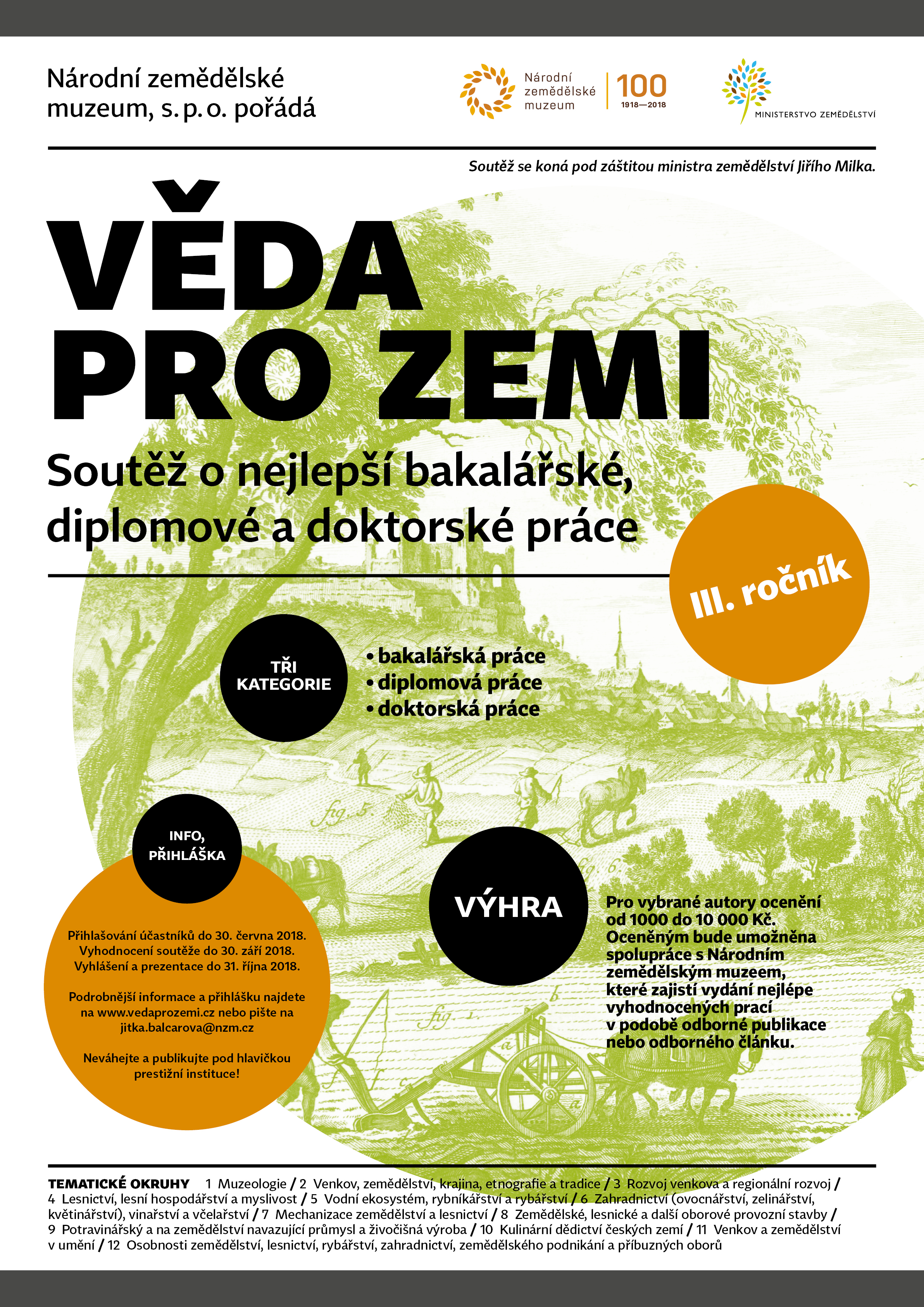 Národní zemědělské muzeum vyhlašuje soutěž o nejlepší bakalářské, diplomové a doktorské práce Věda pro zemi. Práce lze přihlašovat do 30. června 2018. Tematické okruhy a další informace o soutěži naleznete v příloze a na www.vedaprozemi.cz.