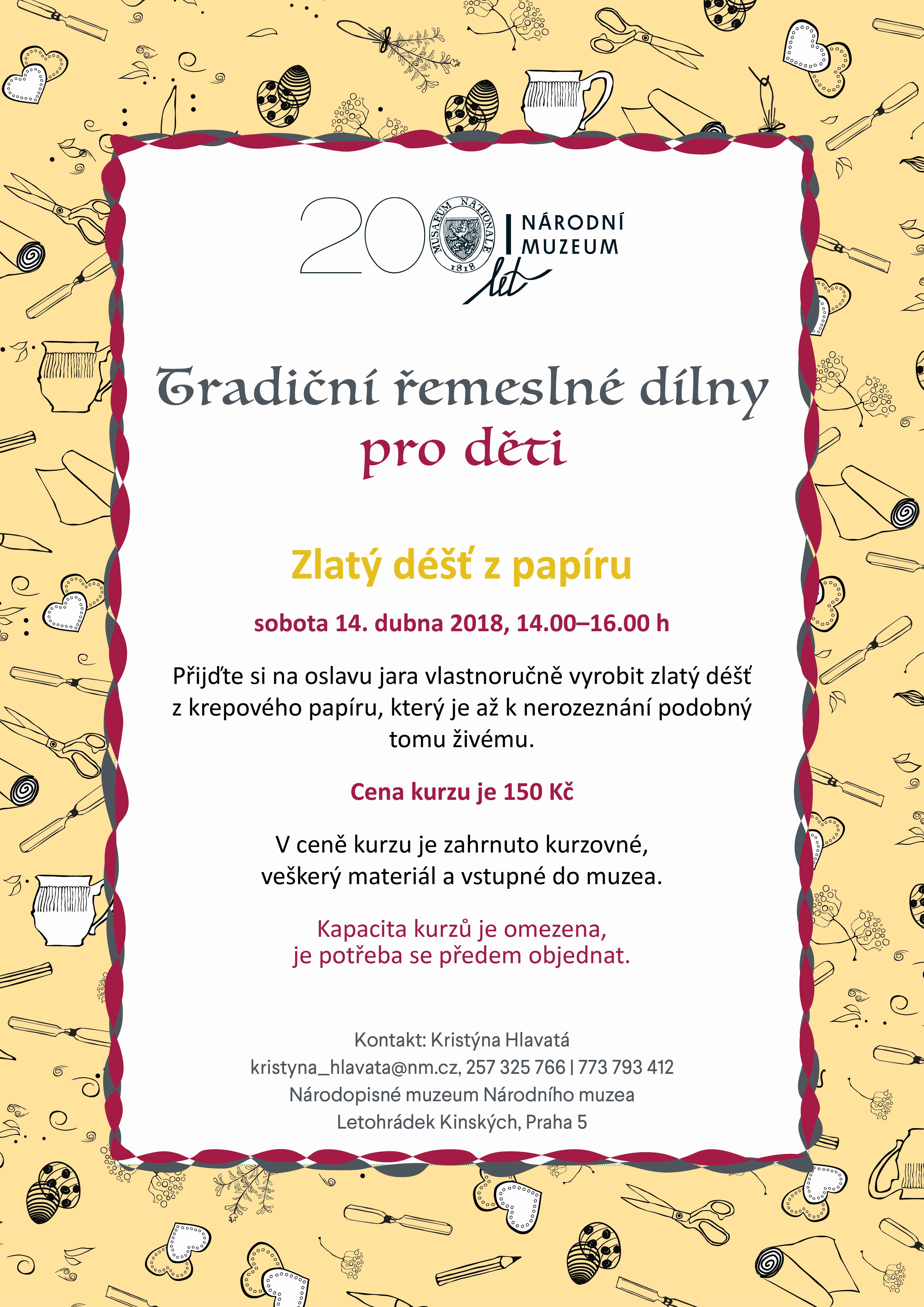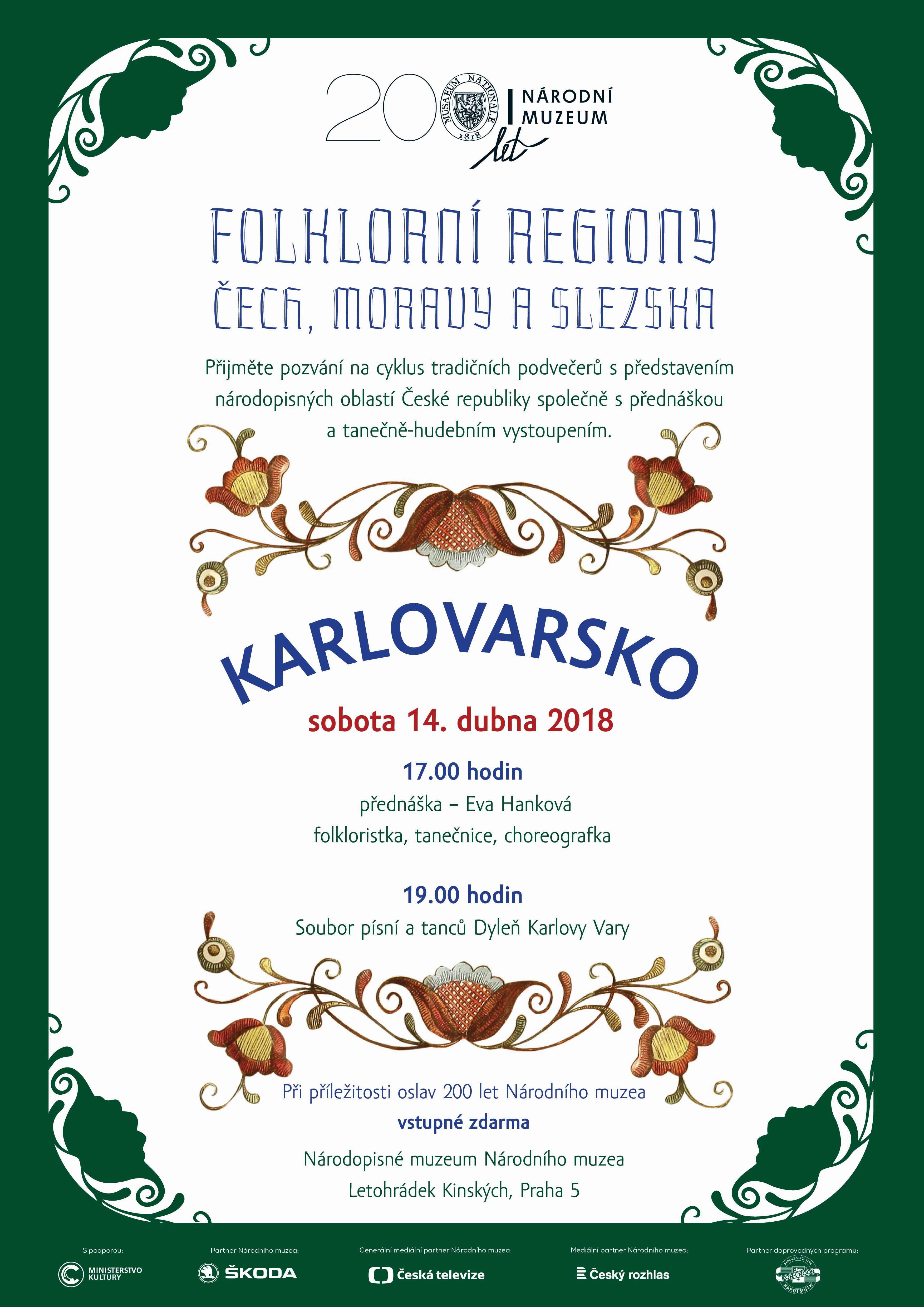 Národopisné muzeum Národního muzea v Praze připravilo na duben několik akcí. Začínají 5. dubna přednáškou o světské mluvě v kontextu středoevropského argotu v rámci cyklu Slovo, tradice a kontext. Dne 10. dubna bude otevřena nová výstava Modrotisk tradiční a netradiční. Tradiční řemeslné dílny připravily na 14. dubna paličkování. V cyklu Folklorní regiony Čech, Moravy a Slezska se týž den představí Karlovarsko. Dubnový program Národopisného muzea obohatí dvoudenní program 14. a 15. dubna, kdy Národní muzeum oslaví 200. výročí svého založení. Podrobnosti k programům najdete v přílohách.