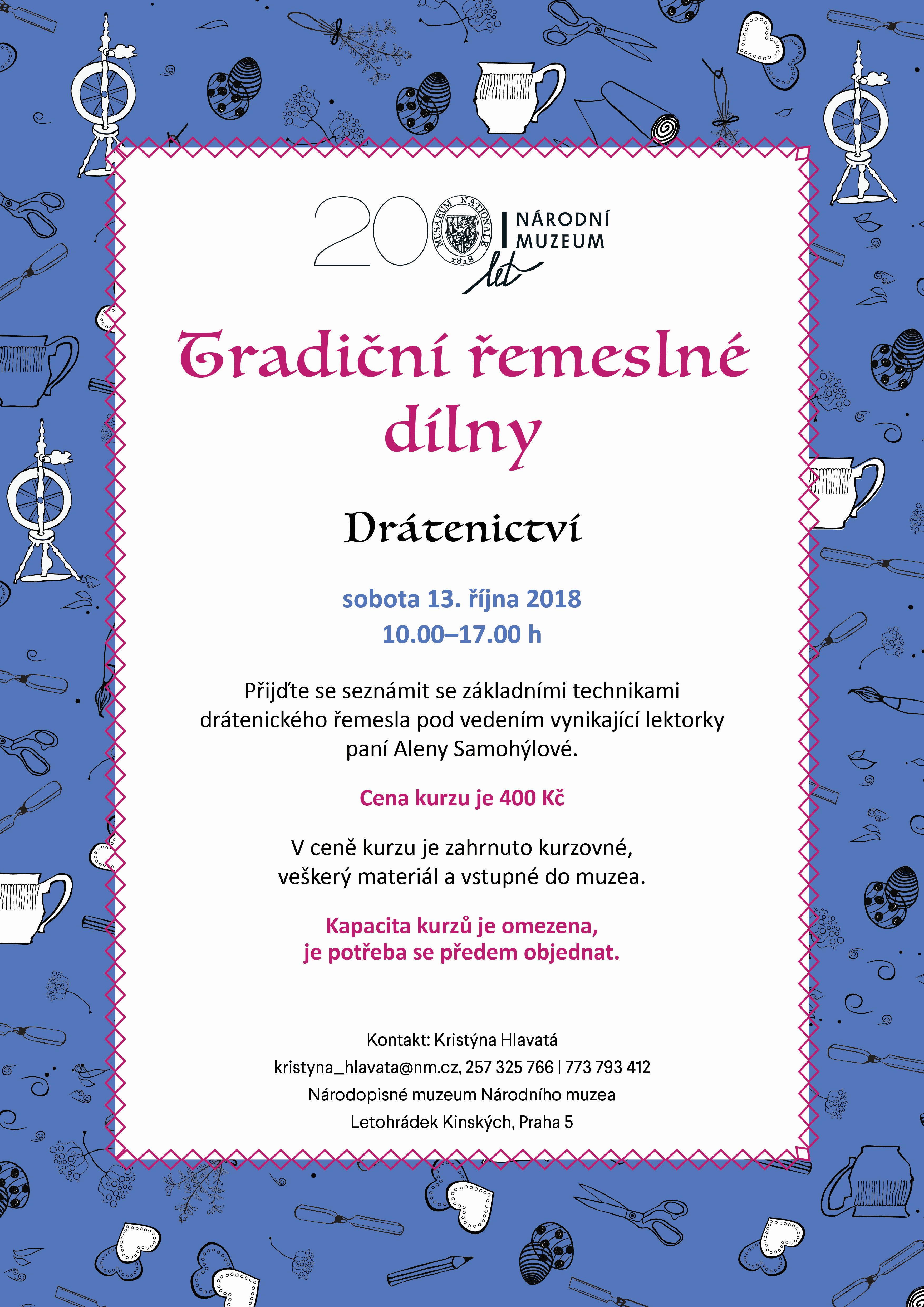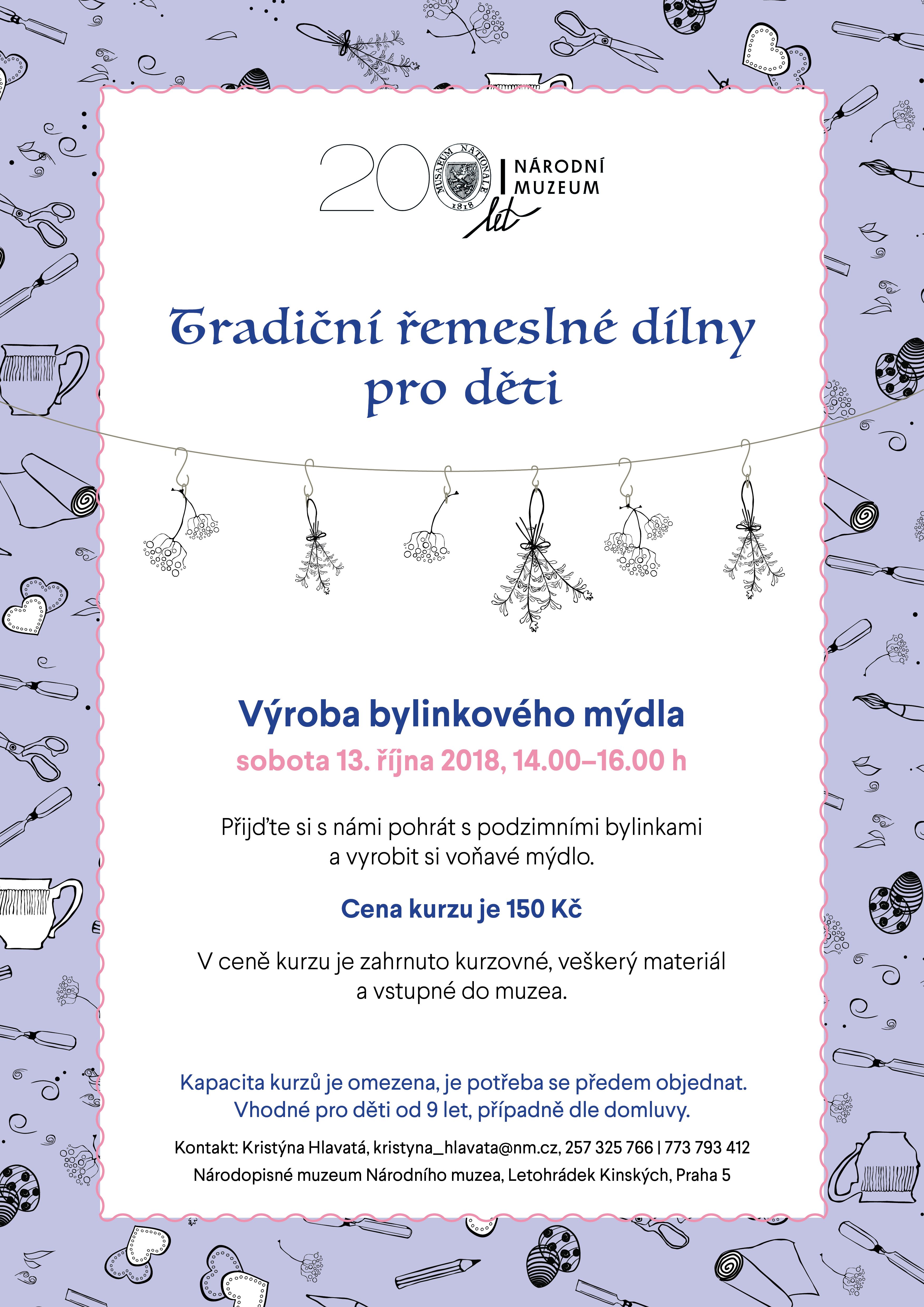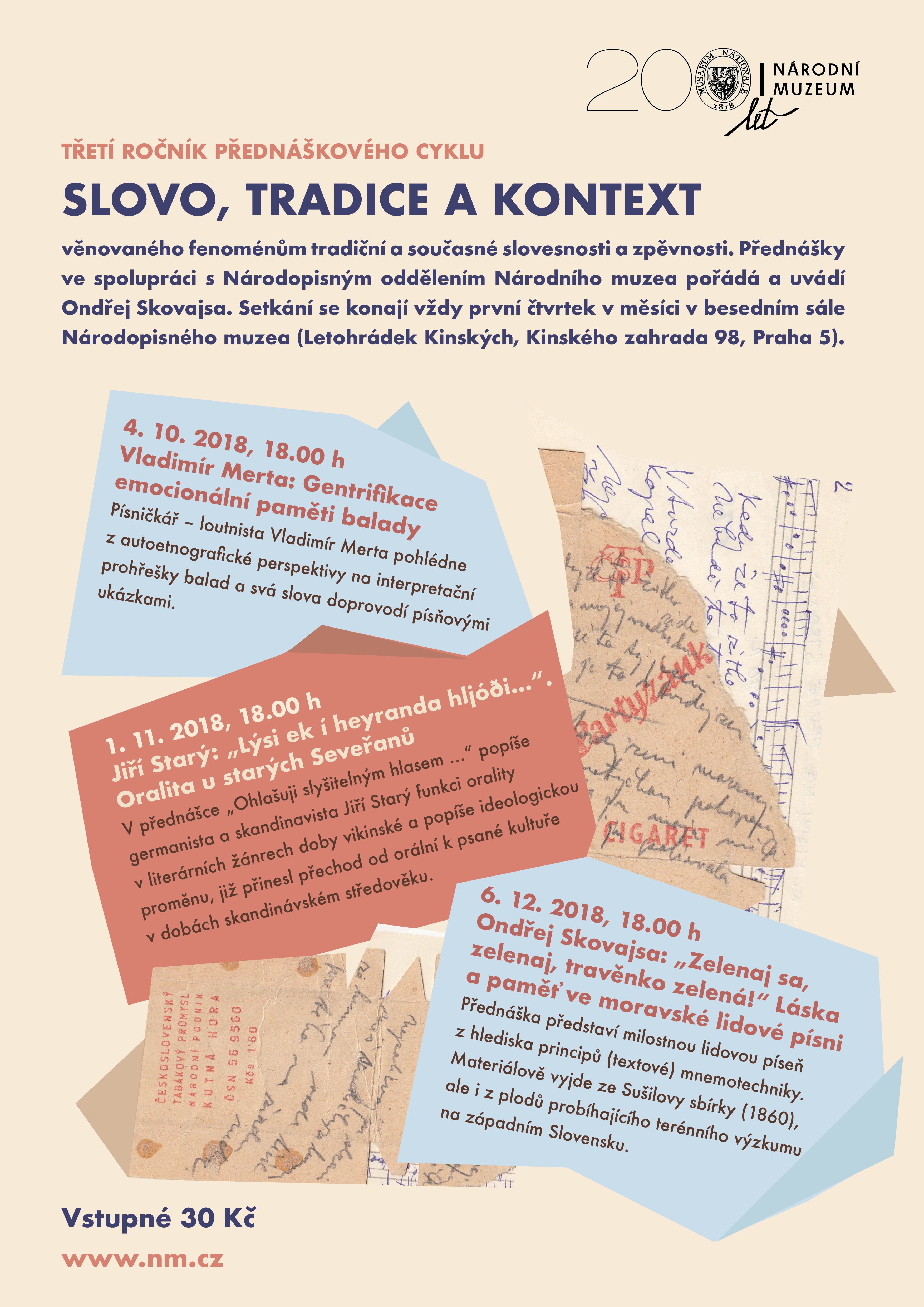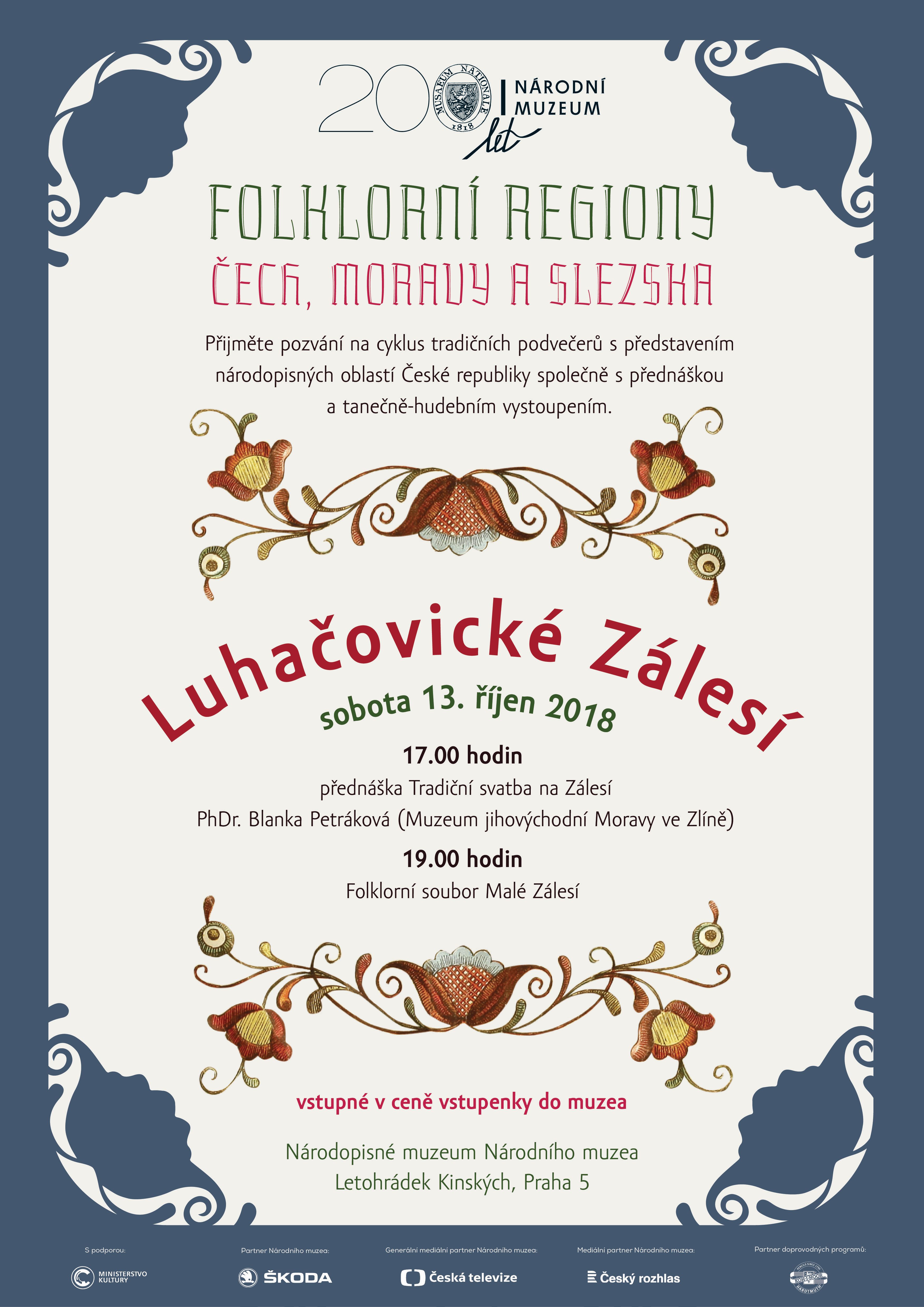 Národopisné muzeum Národního muzea v Praze připravilo na říjen několik akcí. V cyklu Slovo, tradice a kontext vystoupí 4. října Vladimír Merta s přednáškou Gentrifikace emocionální paměti balady – archeologie budoucnosti. V rámci Folklorních regionů Čech, Moravy a Slezska se 13. října představí Luhačovské Zálesí. Tradiční řemeslné dílny proběhnou 13. října – pro dospělé jsou věnovány drátenictví, pro děti výrobě bylinkového mýdla. Dále můžete navštívit dvě výstavy – Dráteníci a drátenictví a Století trampingu. Podrobnosti k programům najdete v přílohách.