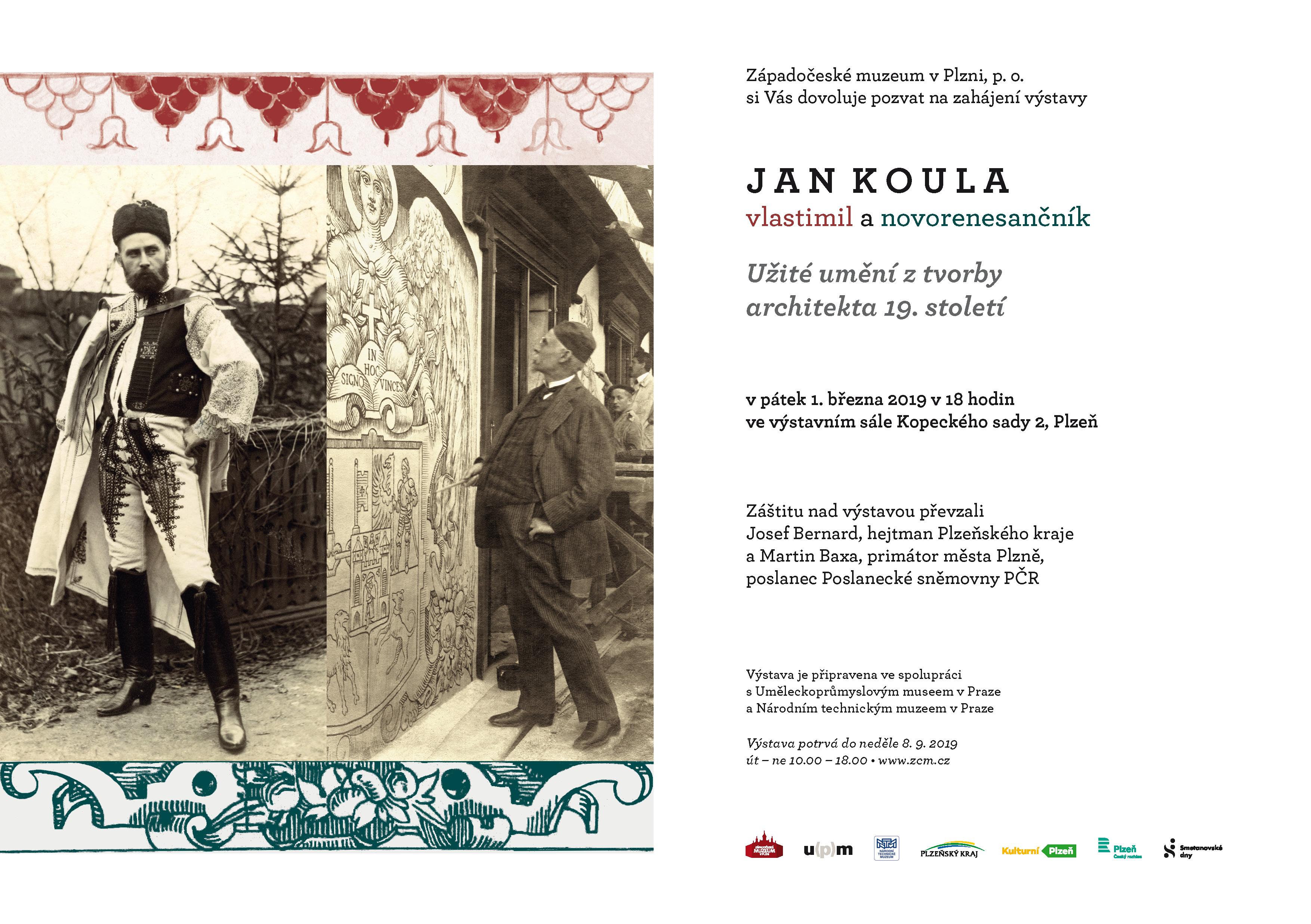 Západočeské muzeum v Plzni, p. o., si Vás dovoluje pozvat na výstavu Jan Koula - vlastimil a novorenesančník. Užité umění z tvorby architekta 19. století. Zahájení výstavy se uskuteční v pátek 1. března 2019 v 18.00 hod. ve výstvaním sále Kopeckého sady 2. Plzeň. Výstava potrvá do neděle 8. září 2019.