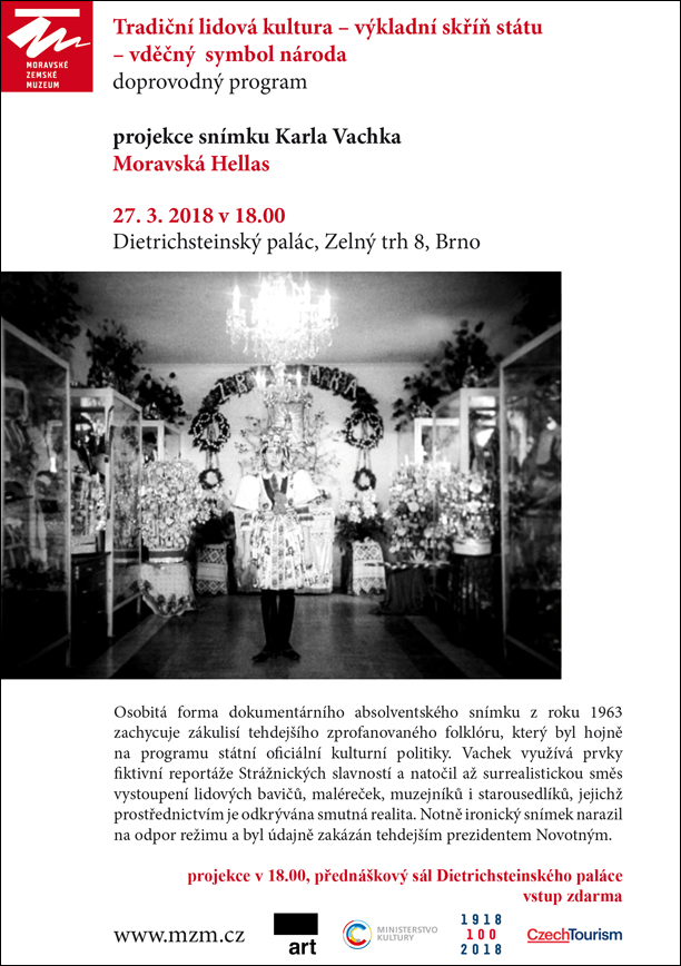 Moravské zemské muzeum zve v rámci doprovodného programu výstavy Etnografického ústavu MZM Tradiční lidová kultura – výkladní skříň státu – vděčný symbol národa na promítání filmu Karla Vachka Moravská Hellas. Promítání se koná 27. 3. 2019 v 18.00 v Dietrichsteinském paláci.