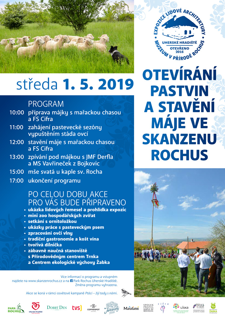 Park Rochus v Uherském Hradišti zve 1. května 2019 na Otevírání pastvin a stavění máje na Rochusu. Na programu jsou akce pro děti i dospělé – těšit se můžete nejen na přípravu a stavění máje nebo informace o pastevectví, ale i na vystoupení lidové muziky, gastronomické akce či setkání s ornitoložkou.