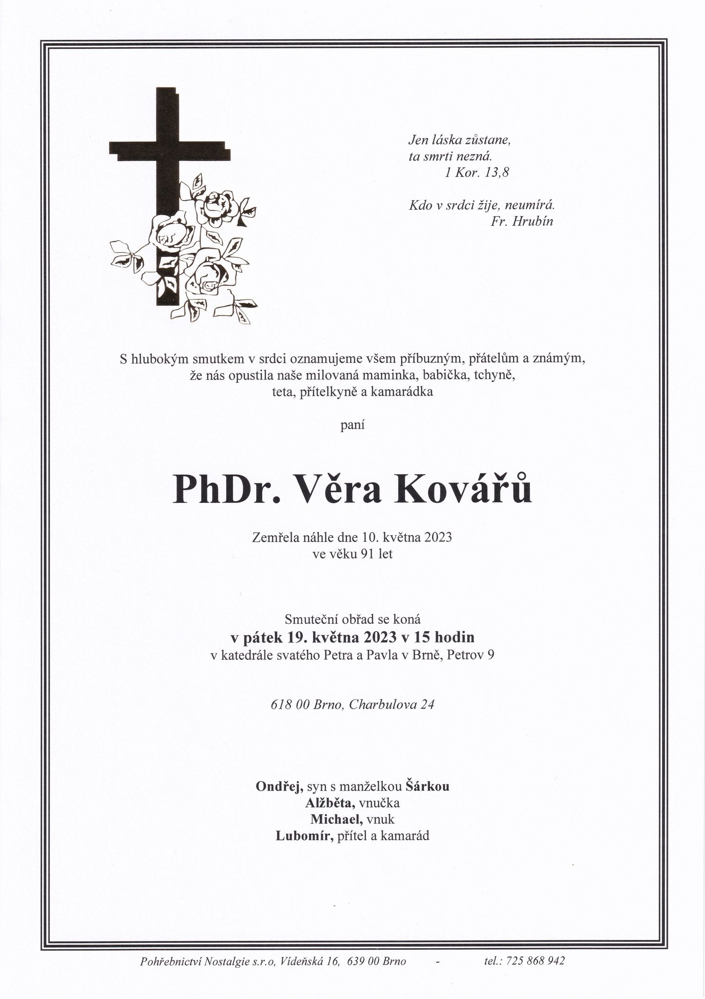 Dne 11. května 2023 zemřela PhDr. Věra Kovářů, významná etnografka, pracovnice památkové péče a zejména specialistka na lidovou architekturu. Mimo své odborné zaměření byl její celoživotní vášní folklor, zvláště pak lidový tanec. Za své celoživotní zásluhy se V. Kovářů právem stala čestnou členkou České národopisné společnosti. Natrvale pak zůstane zachována její nesmazatelná stopa v oboru etnologie a snaze o jeho popularizaci. Poslední rozloučení s touto přátelskou, energickou ženou, plnou elánu, chuti a radosti ze života se bude konat dne 19. května v 15 hodin v katedrále svatého Petra a Pavla v Brně. Čest její památce.