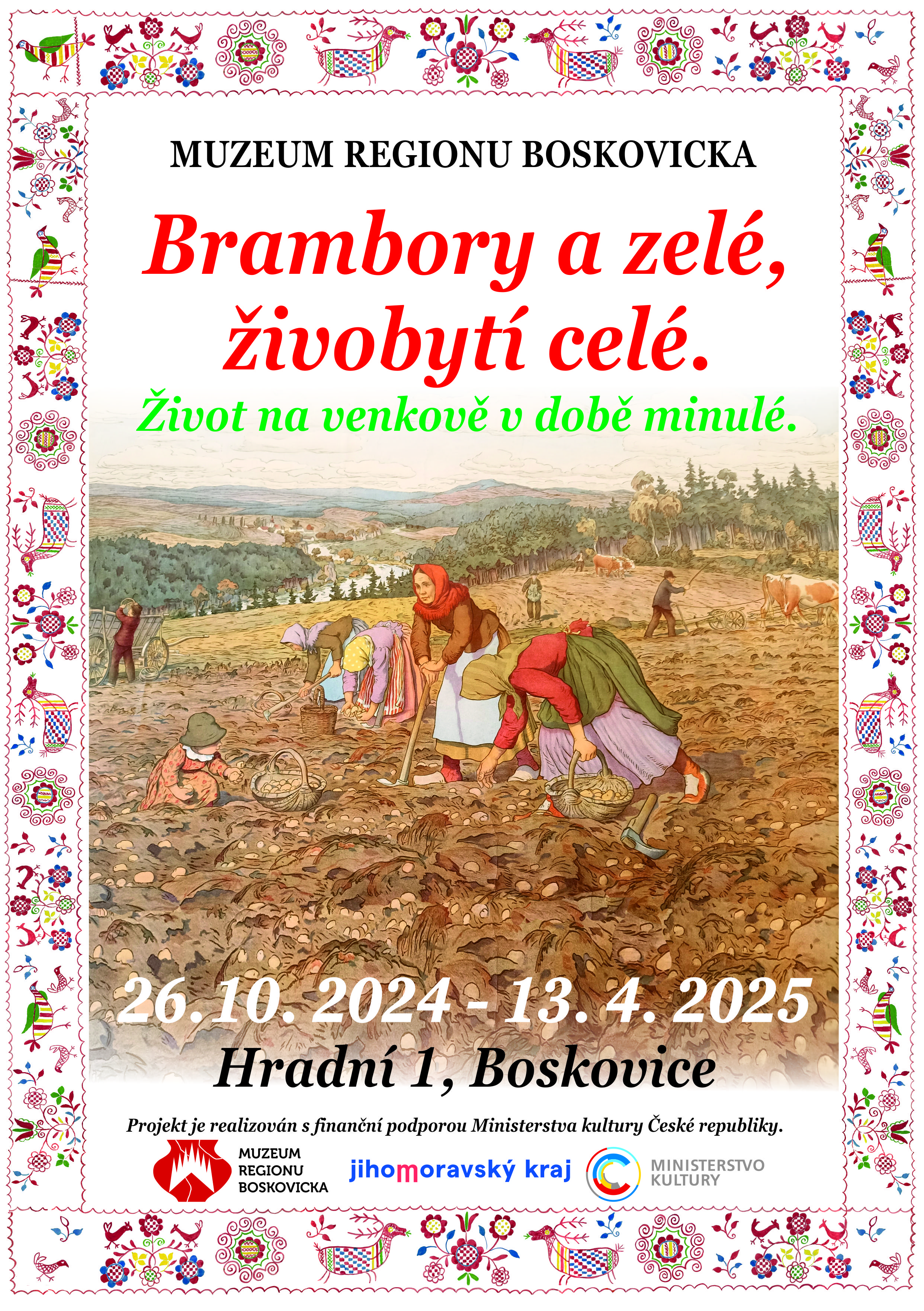 Muzeum regionu Boskovicka 26. 10. 2024 - 13. 4. 2025, Hradní 642/1, Boskovice. Jak vypadal život a živobytí na Boskovickém venkově v dobách minulých? Více, než teď bylo vše spjato s prací na poli, v sadě i v lese. Tempo života na venkově určovaly zemědělské práce a starost o dobytek. Výstava Vás zavede do prostředí venkovské usedlosti v dobách minulých. Výstava je díky množství interakcí vhodná pro rodiny s dětmi. Vástava nabízí i edukační program pro školní skupiny. Součástí výstavy je i výběr školních obrazů zapůjčených z Muzea Komenského v Přerově. Výstava vznikla za finanční podpory Ministerstva kultury České republiky. Podrobnosti viz https://www.muzeum-boskovicka.cz/brambory-zele-zivobyti-cele-zivot-na-venkove-v-dobe-minule