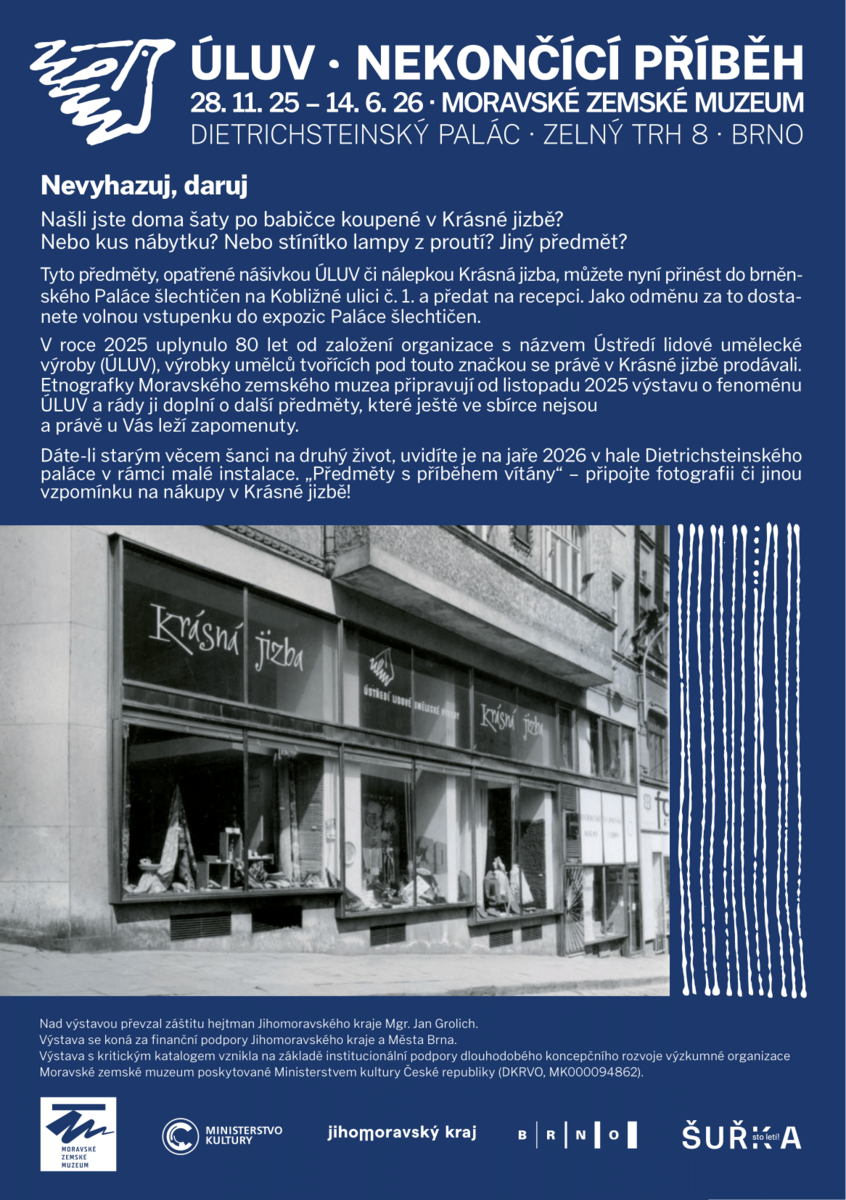 Zkratka ÚLUV tvořila značku organizace Ústředí lidové umělecké výroby podílející se ve druhé polovině 20. století na formování životního stylu československé společnosti především v oblasti oděvní a bytové kultury. Etnografický ústav MZM byl jediným národopisným muzeem v českých zemích, které soustavně mohlo sledovat vývoj a zároveň shromažďovat strukturální změny lidové umělecké výroby. V letech 1973-1993 dokumentoval ústav činnost ÚLUV formou nákupů oceněných výrobků z různých soutěží i z běžné nabídky. Vzhledem k zániku ÚLUV byla v Brně shromážděna jedinečná kolekce zachycující stav soudobé umělecké výroby inspirované tradicí. Výstava mapující muzejní sbírku ÚLUV nebyla dosud prezentována. Podrobnější info viz odkaz: